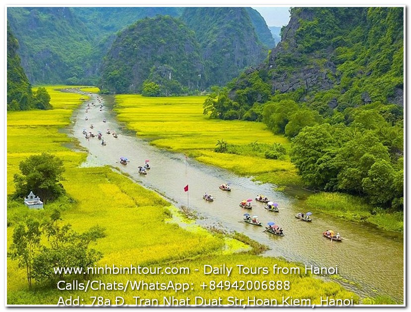 12:50 - 13:00: Get on the tourist bus continue going to Trang An wharf, take boat trip to visit Trang An cave complex and the scene of King Kong film.